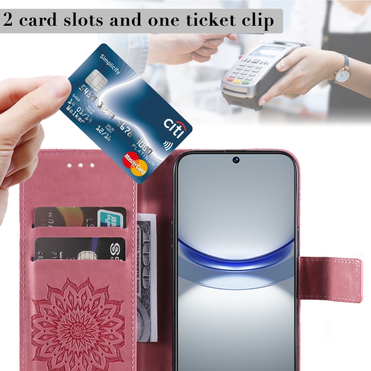 La Funda de Cuero con Tapa para Huawei Nova 12S con patrón de girasol en relieve en color Rosa está diseñada para proporcionar una protección integral y funcionalidad Adicional al dispositivo. Fabricada con materiales de alta calidad, combina PU y TPU para ofrecer durabilidad y resistencia al desgaste. Esta Funda es compatible exclusivamente con el modelo Huawei Nova 12S, facilitando el acceso Completo a todos los Botones, Puertos y conexiones, incluyendo el Cable de Auriculares. Su diseño incluye una función de Soporte que permite liberar las manos durante la visualización de contenido multimedia, así como ranuras integradas para Tarjetas y efectivo, otorgando practicidad y comodidad en el uso diario.