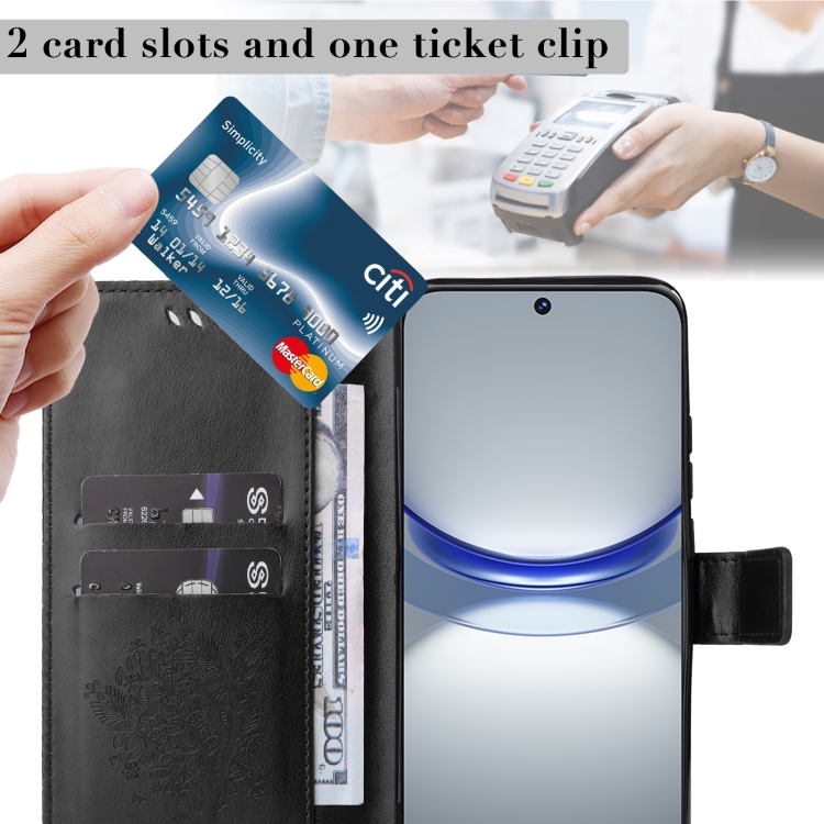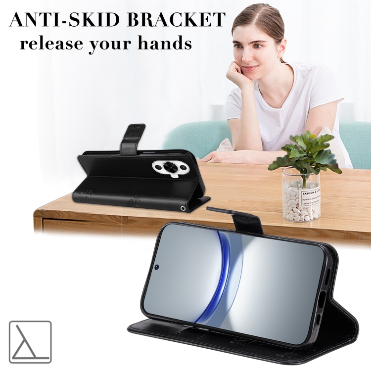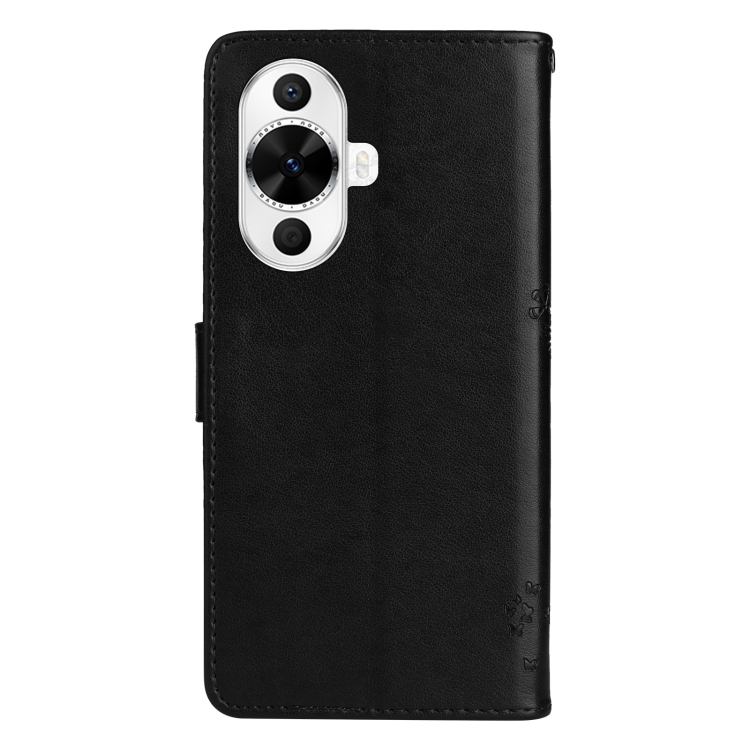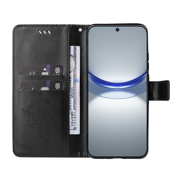 Funda para Huawei Nova 12S de Cuero con Tapa y Patrón en Relieve Árbol y Gato (Negro)