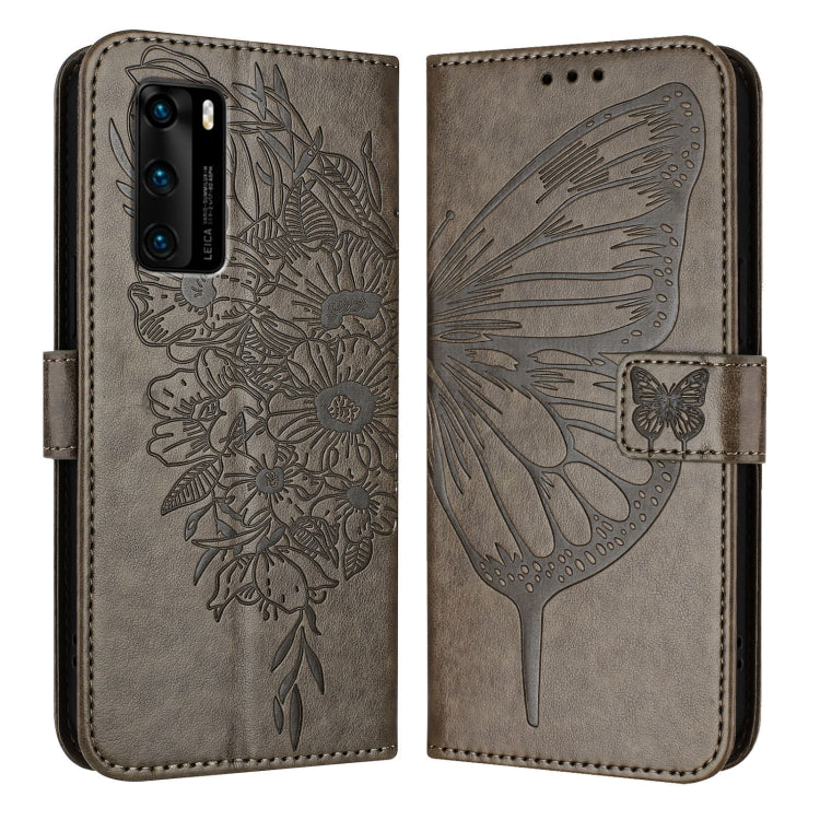 Funda de Cuero para Huawei P40 con Mariposa en Relieve (Gris)