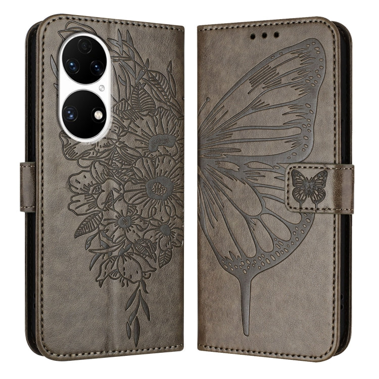 Funda de Cuero para Huawei P50 Pro con Mariposa en Relieve (Gris)