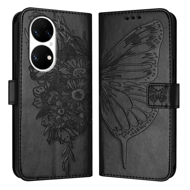 Funda de Cuero para Huawei P50 Pro con Mariposa en Relieve (Negro)