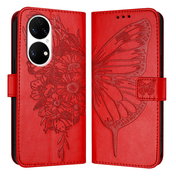 Funda de Cuero para Huawei P50 Pro con Mariposa en Relieve (Rojo)