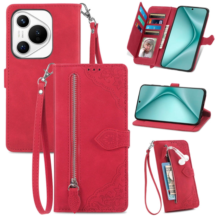Funda de Cuero para Huawei Pura 70 con Cremallera y Flores en Relieve Ultra (Rojo)