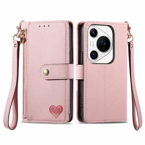 - 1x Funda de Cuero para Huawei Pura 70 Pro Love Zipper Lanyard (Rosa)