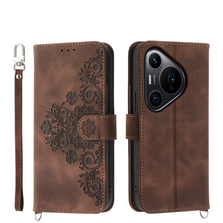 Funda de Cuero para Huawei Pura 70 Pro y Pura 70 Pro+ con Billetera y Flores en Relieve (Marrón)