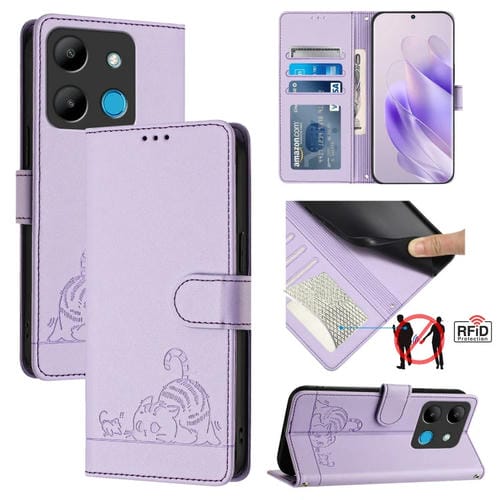 Estuche para Teléfono Infinix Smart 7 India Cat Rat Cuero Rfid con Patrón en Relieve y Cordón (Púrpura)