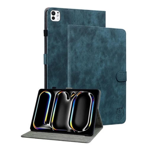 Funda de Piel para iPad Pro 11 (2024) Estampado de Tigre En Relieve (Azul Oscuro)