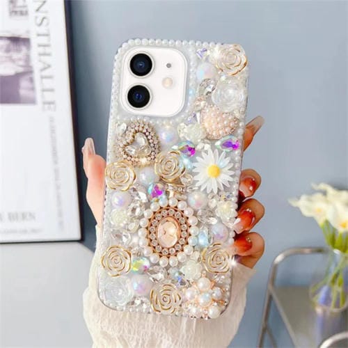Estuche para Teléfono iPhone 11 con Rosa con Incrustaciones de Diamantes (Blanco)