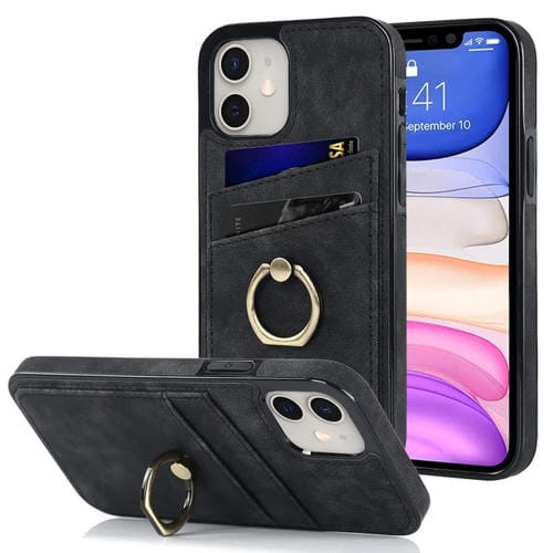 Funda de Teléfono iPhone 11 Cuero con Parche Vintage y Soporte para Anillo (Negro)