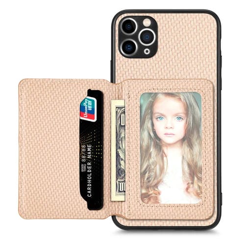 Caja de teléfono para iPhone 11 Pro con bolsa de tarjeta magnética de fibra de carbono (Caqui)