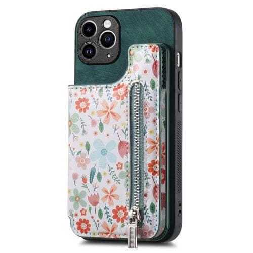 Estuche para Teléfono iPhone 11 Pro con Billetera y Cremallera Pintada Retro (Verde)