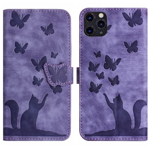 Funda de Teléfono iPhone 11 Pro Max Butterfly Cat Cuero con Tapa En Relieve (Púrpura)