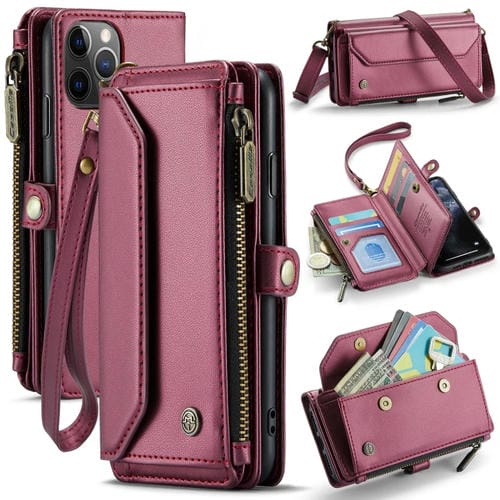 Estuche para teléfono Caseme C36 para iPhone 11 Pro Max con ranuras para tarjetas cartera con cremallera cuero antirrobo RFID (Rojo Vino)