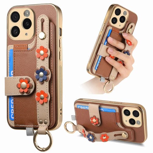 Funda para Teléfono iPhone 11 Pro Max Flores Estereoscópicas Pulsera Bolsa para Tarjeta (Marrón)