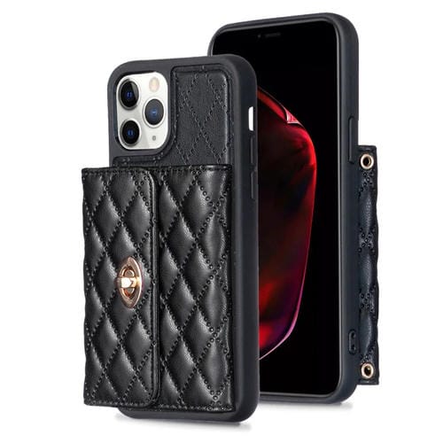 Funda para iPhone 11 Pro Max Horizontal Metal Hebilla Monedero Rombico Cuero (Negro)