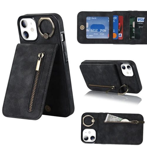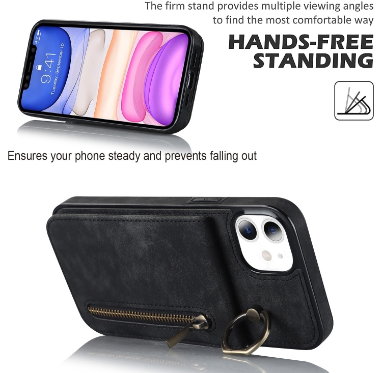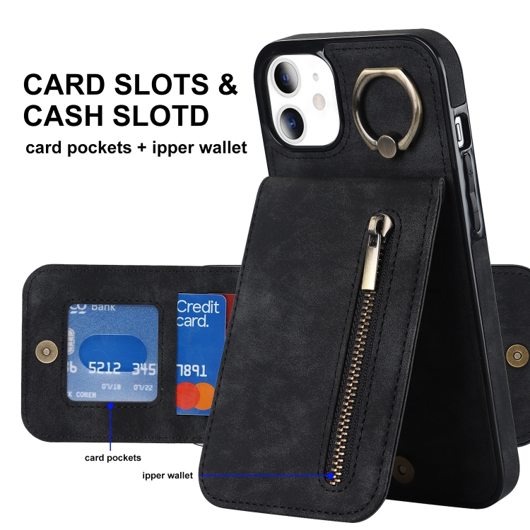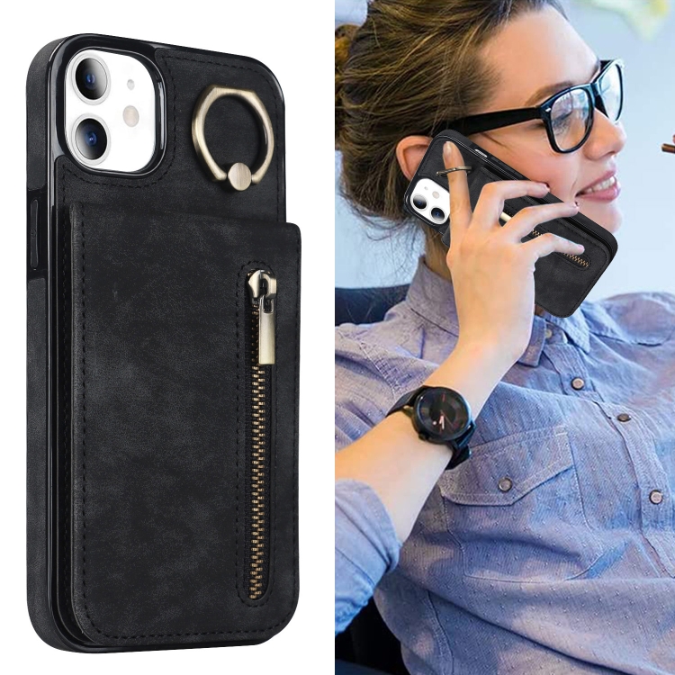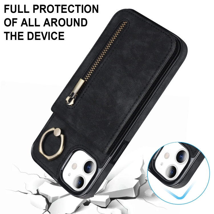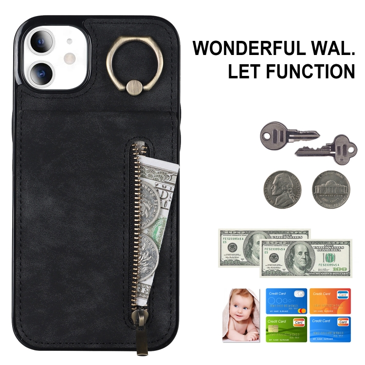 Funda para iPhone 11 Retro Ring y Zipper con Ranura RFID para Tarjetas (Negro)