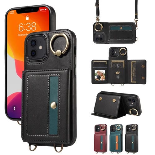 Funda de Cuero para iPhone 12/12 Pro con Soporte para Anillo y Bolso Cruzado para Tarjetas (Negro)