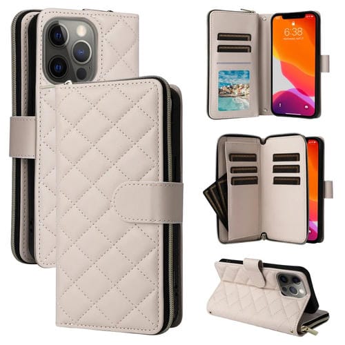 For iPhone 12/12 Pro Leather Phone Case Tower Buckle Rhombic Zipper Crossbody Lanyard Case(Beige)