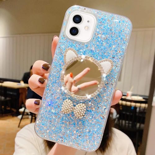 Funda para Teléfono TPU Epoxi iPhone 12 con Espejo Orejas de Gato Lentejuelas Estrelladas (Azul)