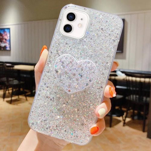 Funda para Teléfono TPU Epoxi iPhone 12 Soporte Corazón Lentejuelas Estrelladas (Plateado)