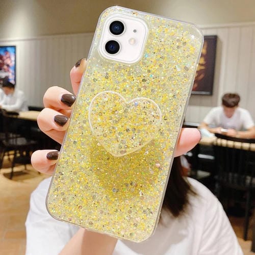 Funda para iPhone 12 Mini TPU Epoxi con Soporte Corazón Lentejuelas Estrelladas (Amarillo)