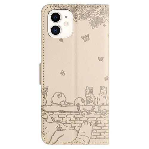 Funda de Cuero para iPhone 12 Mini Cat Relieve Patrón con Cordón (Beige)