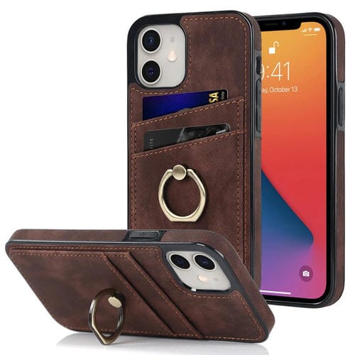 Funda para iPhone 12 Mini Cuero Parche Vintage Soporte para Anillo (Marrón)