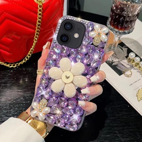 Funda para Teléfono iPhone 12 Mini Forma de Girasol con Diamante Colocada a Mano (Púrpura)