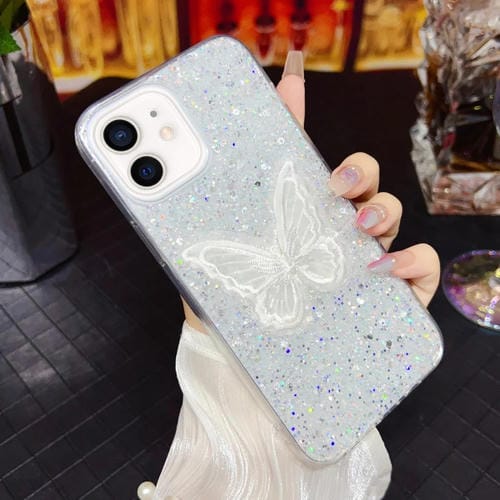 Funda para Teléfono iPhone 12 Mini TPU Epoxi Mariposa Bordada Lentejuelas Estrelladas (Plateado)