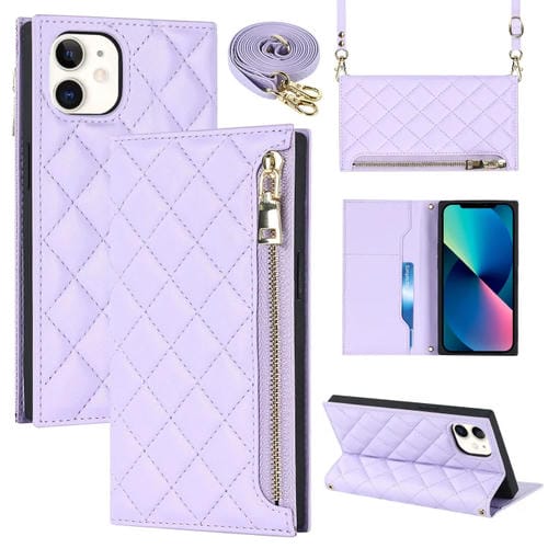 Funda de Cuero para iPhone 12 Mini Grid Texture con Lanyard y Cremallera (Púrpura)