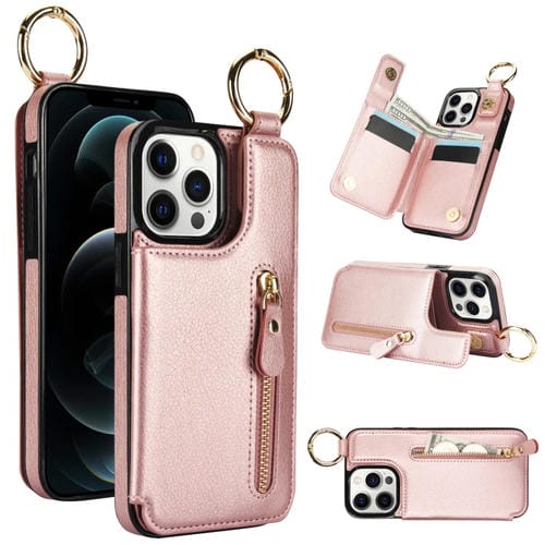 Funda para Teléfono iPhone 12 Pro Bolsa para Tarjetas Doble Hebilla Cremallera Textura Litchi (Oro Rosa)