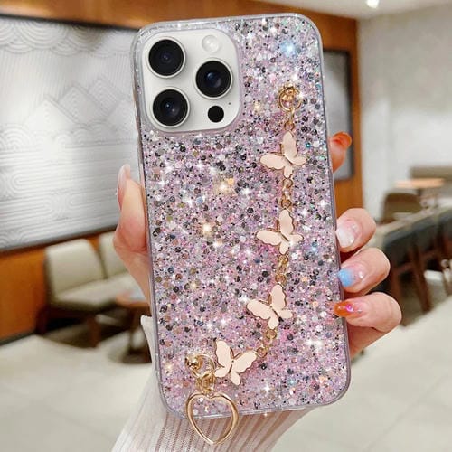 Funda para teléfono TPU Epoxi iPhone 12 Pro con cadena de mariposa y Lentejuelas estrelladas (Rosa)