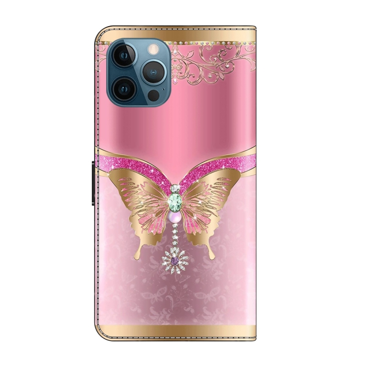 Funda Protectora de Cuero iPhone 12 Pro Max y 13 Pro Max Crystal 3D a Prueba de Golpes (Mariposa Inferior Rosa)