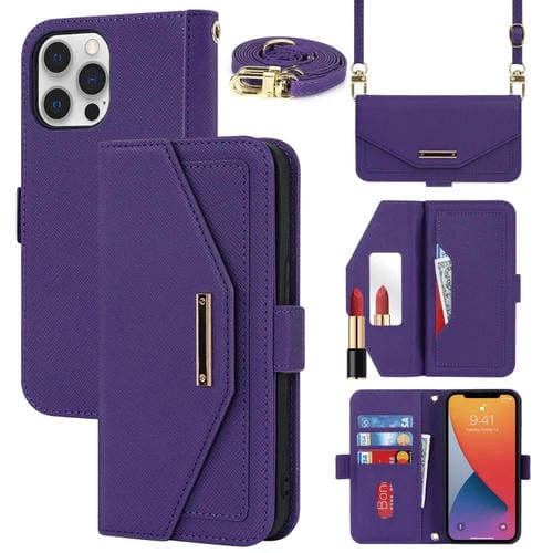 Funda para iPhone 12 Pro Max Cross Texture Lanyard Leather Phone Case (Púrpura)