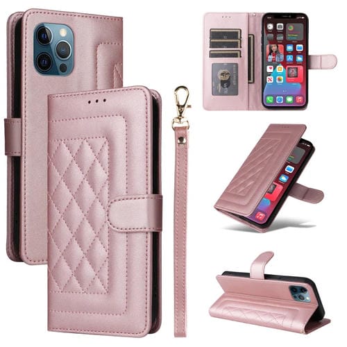 Funda para iPhone 12 Pro Max Diamond Lattice de Cuero con Tapa (Oro Rosa)