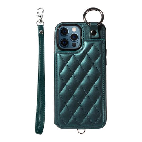 For iPhone 12 Pro Max Phone Case with Rhombic Texture Card Bag and Short Lanyard (Green)