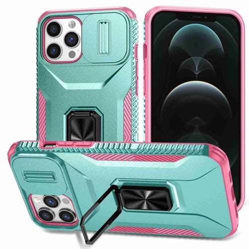 Estuche para teléfono iPhone 12 Pro Max con soporte deslizante para levas (Gris Verde + Rosa)