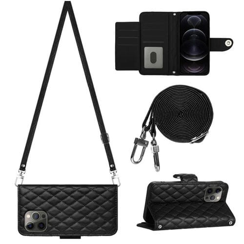 Funda para Teléfono iPhone 12 Pro Max Tapa Cuero Textura Rómbica Cordón Largo (Negro)