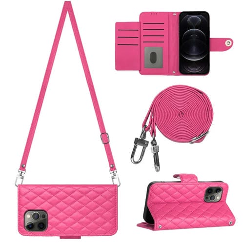 Funda para Teléfono iPhone 12 Pro Max con Tapa de Cuero Textura Rómbica y Cordón Largo (Rojo Rosa)