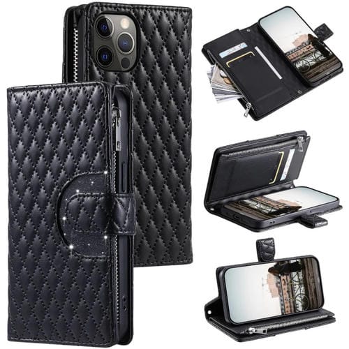 Funda para iPhone 12 Pro Max Glitter Lattice Zipper Wallet de Cuero para Teléfono (Negro)