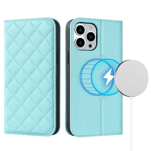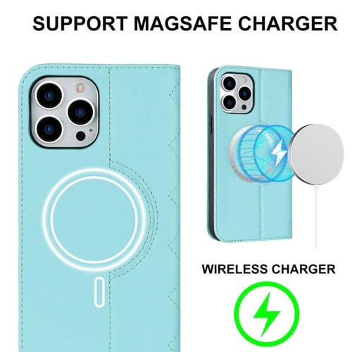 Funda para iPhone 12 Pro Max Rhombic Magsafe Rfid Antirrobo de Cuero (Azul Cielo)