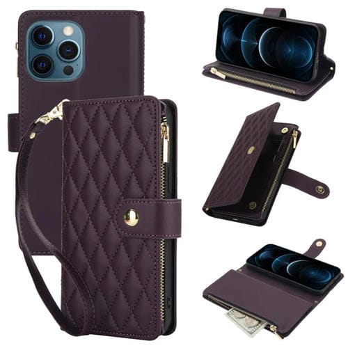 Estuche para teléfono Ym016 iPhone 12 Pro Max con billetera de cuero, cremallera rómbica y cordón (Púrpura Oscuro)