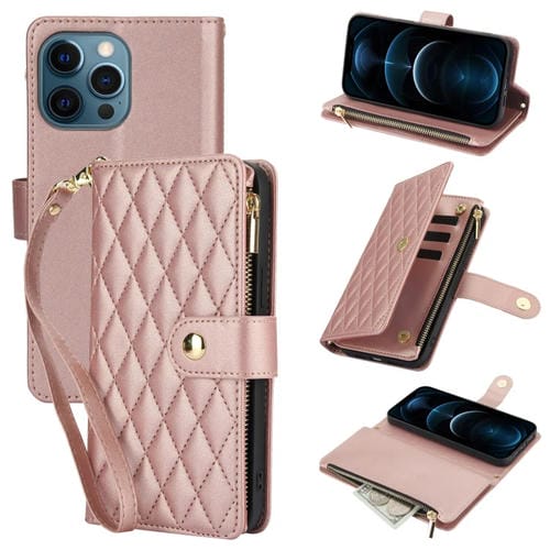Funda de Cuero para iPhone 12 Pro Max Ym016 con Billetera, Tarjeta, Cremallera Rómbica y Cordón (Oro Rosa)