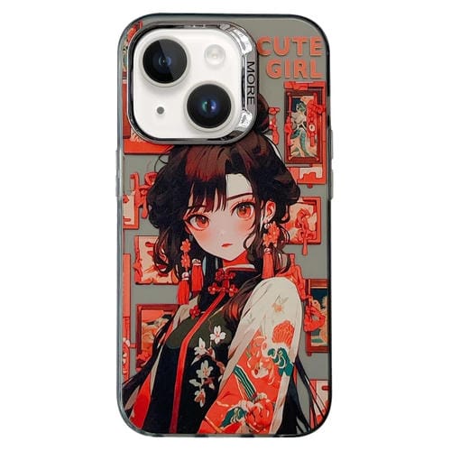 Funda para iPhone 13 Anillo de Lente Electrochapado PC Hybrid TPU Estilo Antiguo Chino (Red Letter Girl)
