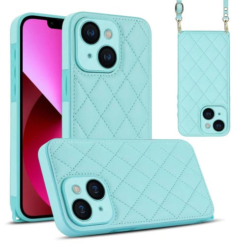 Estuche para teléfono iPhone 13 con textura rómbica y cordón doble (Verde)
