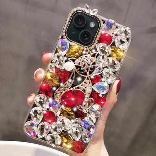 Estuche para Teléfono iPhone 13 PC con Piedras Preciosas y Diamantes de Imitación Hechos a Mano con Zorro (Rojo)
