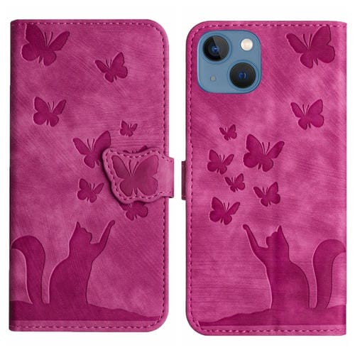 Funda de Cuero para iPhone 13 con Tapa y Estampado de Gato Mariposa (Rosa)