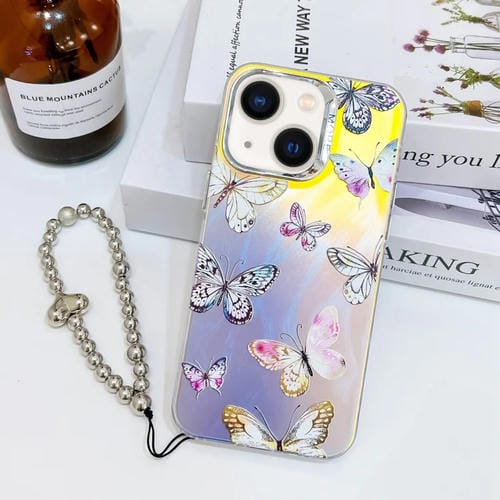 For iPhone 13 Electroplated Laser Butterfly Phone Case with Wrist Strap (AB2 Pink Butterflies)