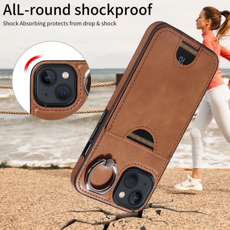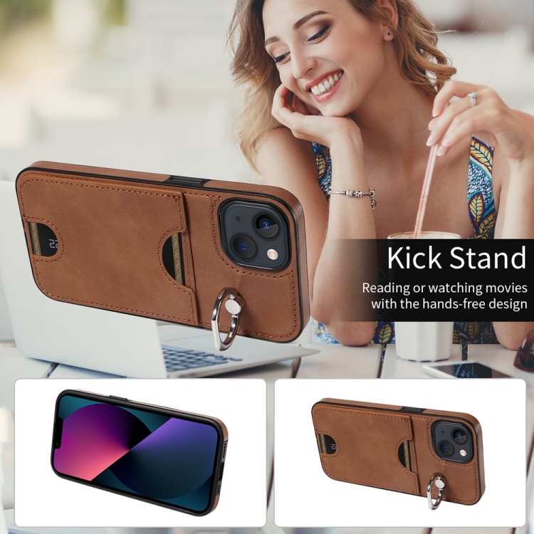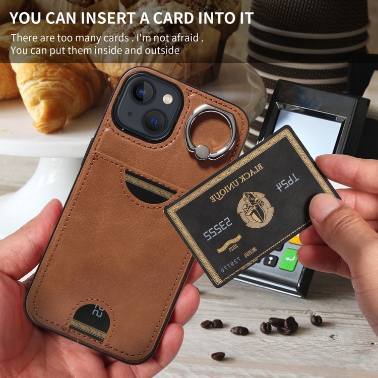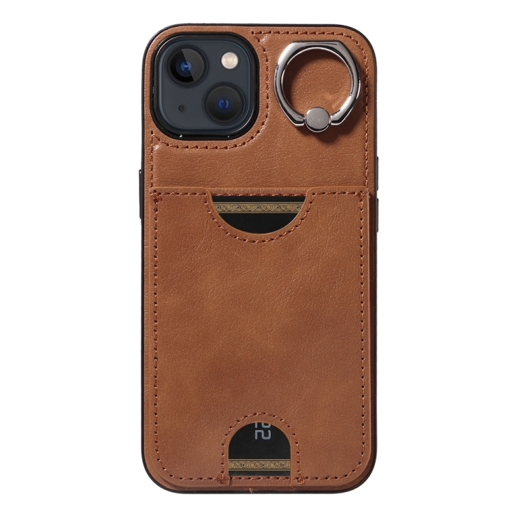 Funda para Teléfono iPhone 13 con Soporte para Anillo y Ranura para Tarjeta con Textura de Becerro (Marrón)
