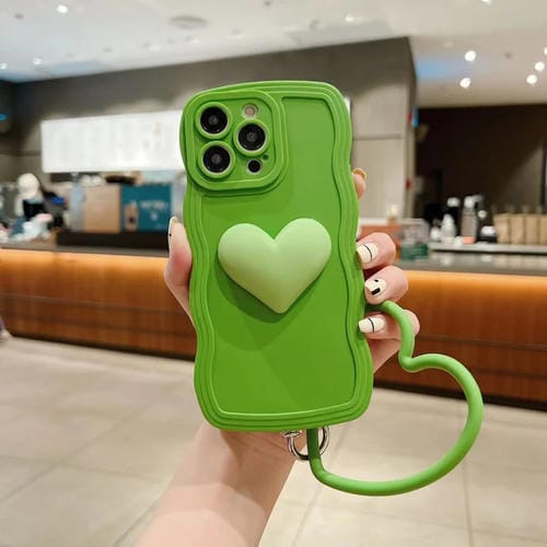 Funda de Silicona para iPhone 13 Pro 3D Heart Skin-Feel con Muñequera (Verde)